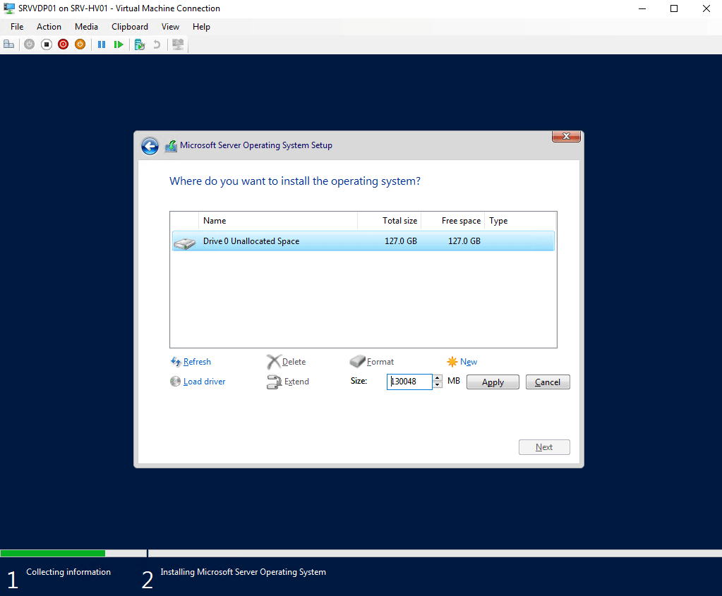 11 – Specify Disk to Install Windows and click New -> Apply and OK.