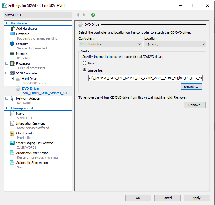 02 – Click on Hyper-V Host and select a Virtual Machine and click Settings -> SCSI Controller -> DVD Drive -> Image File -> Browse and provide a path to Windows ISO and click OK.
