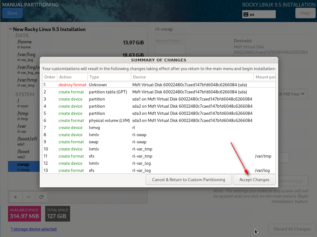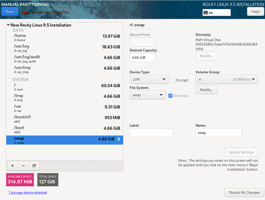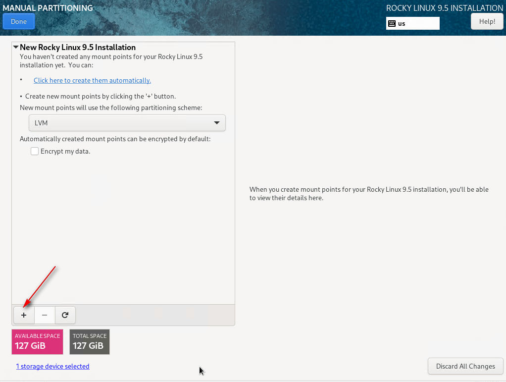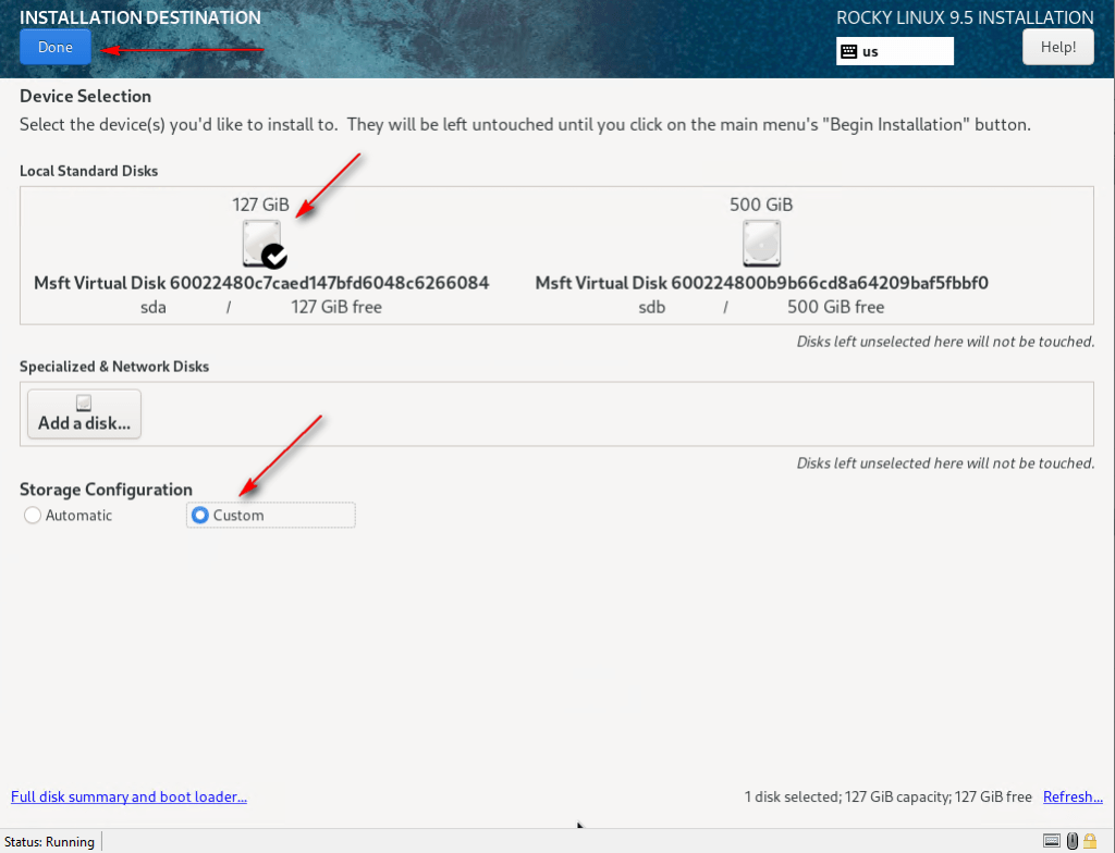08 – In System, select Installation Destination. Choose the disk for Rocky Linux, select Custom under Storage Configuration, and click Done.
