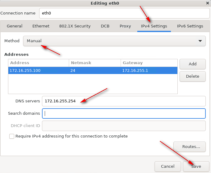 12 – In IPv4 Settings, change Method to Manual, click Add, provide the IP address, Netmask, Gateway, and DNS Servers. Click Save.