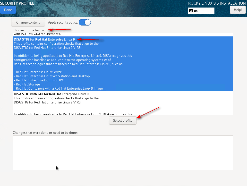 15 – Click Security Profile. Select DISA STIG for Red Hat Enterprise Linux 9 and click Select Profile. Click Done.