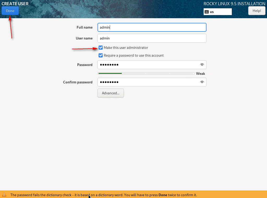 07 – In User Settings, select User Creation, check Make this user administrator, provide a user name, and set a password. You will be required to change this password upon your first login. Click Done.