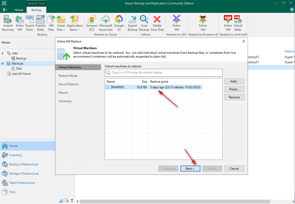 02 – Navigate to Home -> Backups -> Disk. Select VM, right-click, Restore entire VM.