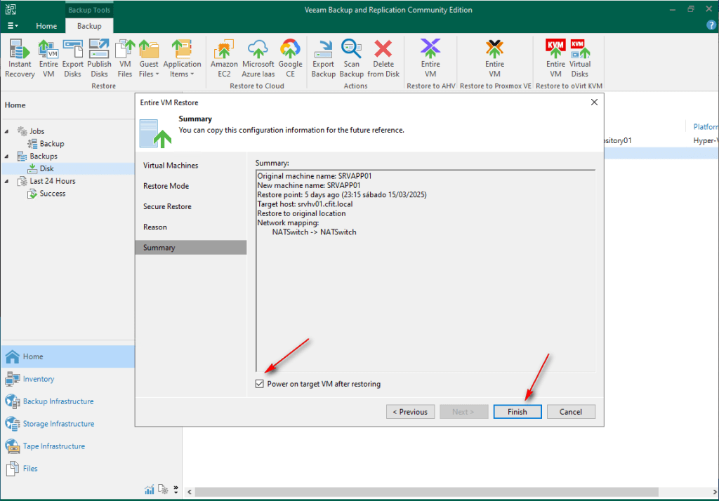 07 – Select Power on target VM after Restore, click Finish, and wait for the restore to complete.