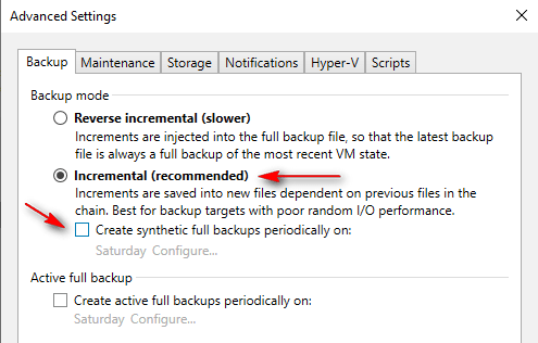 When using Incremental (Forever Forward Incremental) backups with the Create a Synthetic full backups periodically option disabled, the initial backup is a full backup, and all subsequent backups are incremental.