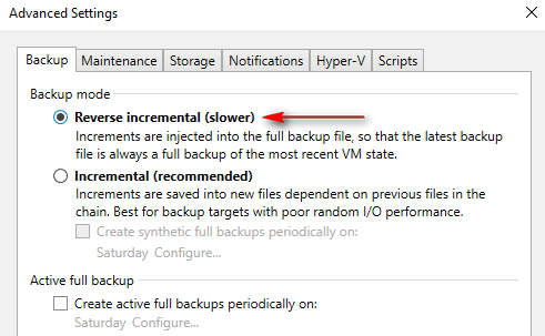 When using Reverse Incremental, your most recent restore point is always a full backup. The initial backup operation generates a full backup, and subsequent backups are incremental, the most recent restore point is always a consolidated full backup.