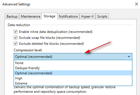 In the Data Reduction settings, you can Enable inline deduplication. This feature compresses and deduplicates backup files on your proxy before they are transported to the repository, thus reducing the size of backups. Additionally, you can exclude swap file blocks (for example, pagefile.sys) and dirty blocks from backups.