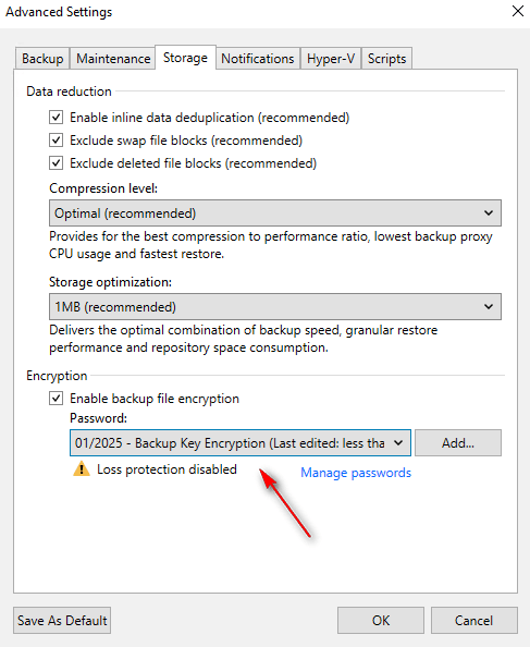 In the Encryption settings, you can enable Veeam to encrypt your backup files at rest. Veeam will write your backups to the repository and protect them using a key. Note: If you lose this key or the keys and do not have Enterprise Manager, you will not be able to import this backup into another Veeam installation (which I will cover in future posts).