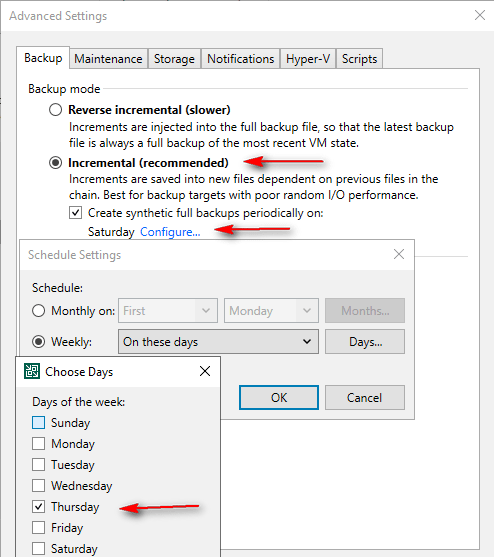 When using Incremental (Forward Incremental) backups with the Create a Synthetic full backups periodically option enabled, you can select a specific day of the week for Veeam to generate a new full backup. The initial backup is a full backup, and the subsequent backups are incremental until the next scheduled Synthetic Full Backup, at which point a new full backup is created, and the incremental chain restarts.
