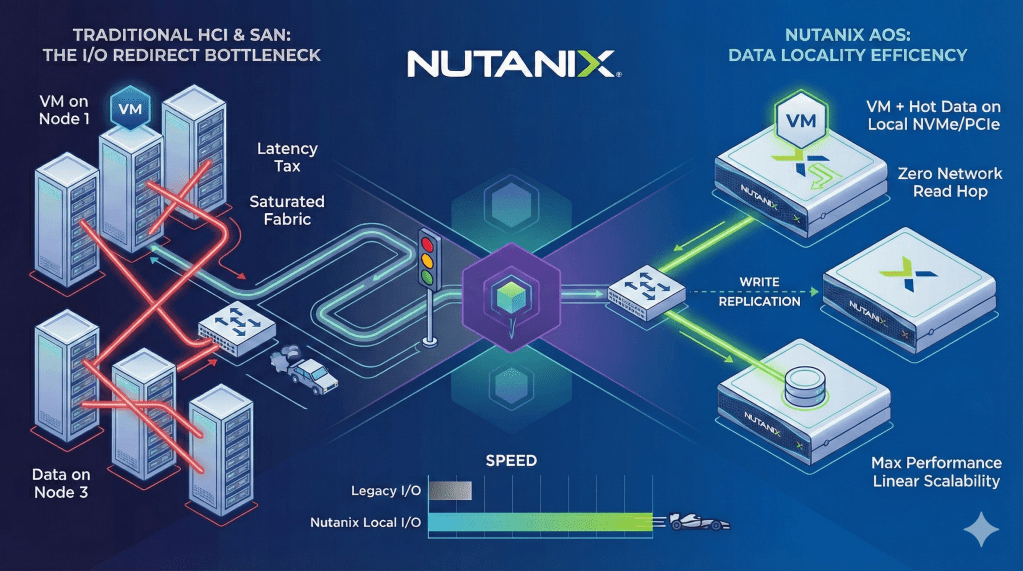 A Nutanix ataca esse problema com um princípio de engenharia chamado Data Locality (Localidade de Dados). Diferente de outras soluções de HCI que distribuem os dados aleatoriamente pelo cluster (similares a um RAID via rede), o Nutanix AOS prioriza obsessivamente manter o dado “quente” no mesmo Node físico onde a Máquina Virtual (VM) está rodando.